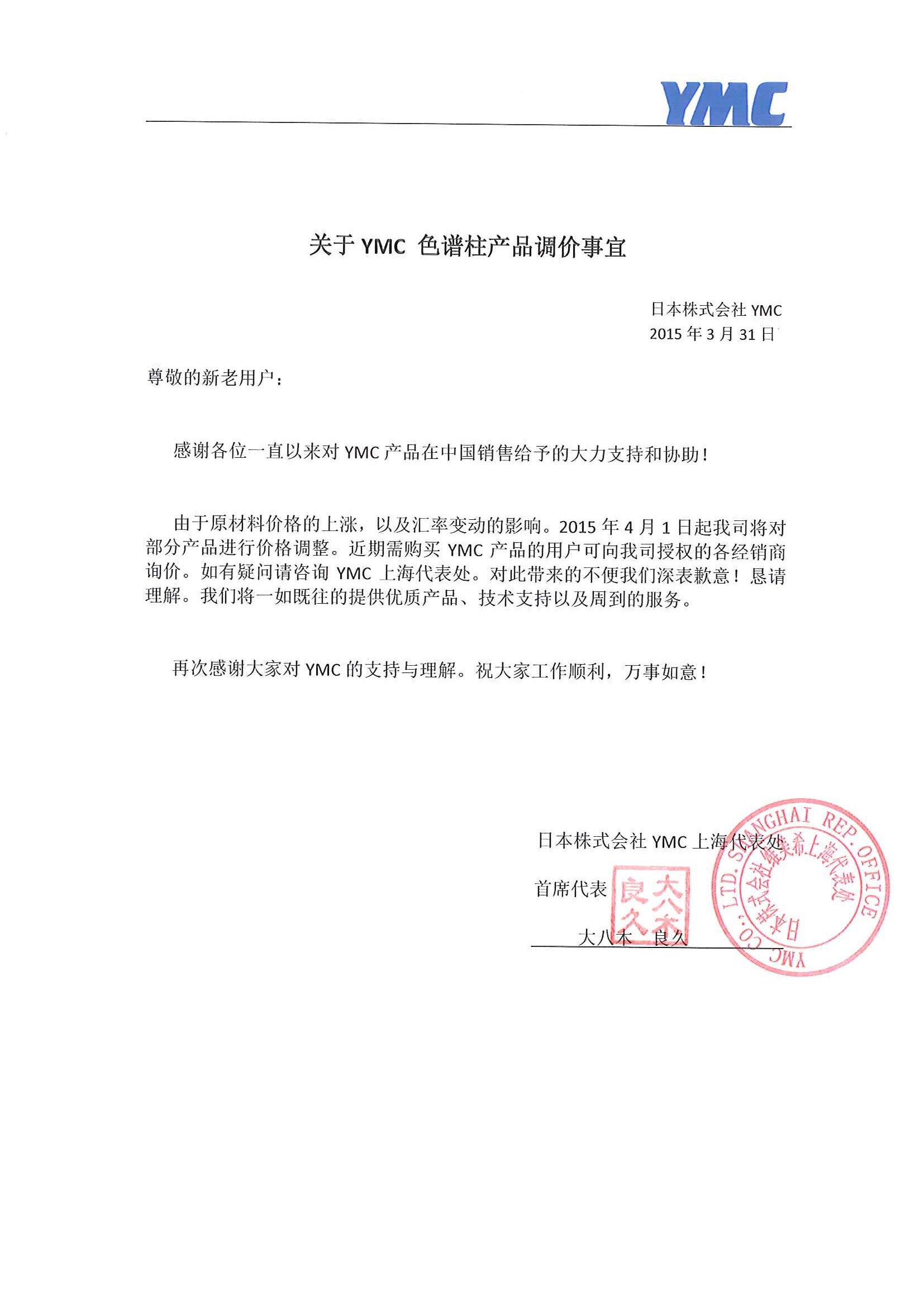 接日本YMC廠家通知,YMC色譜產品于2015年4月1日執行新價格,相對于2014年有上漲。