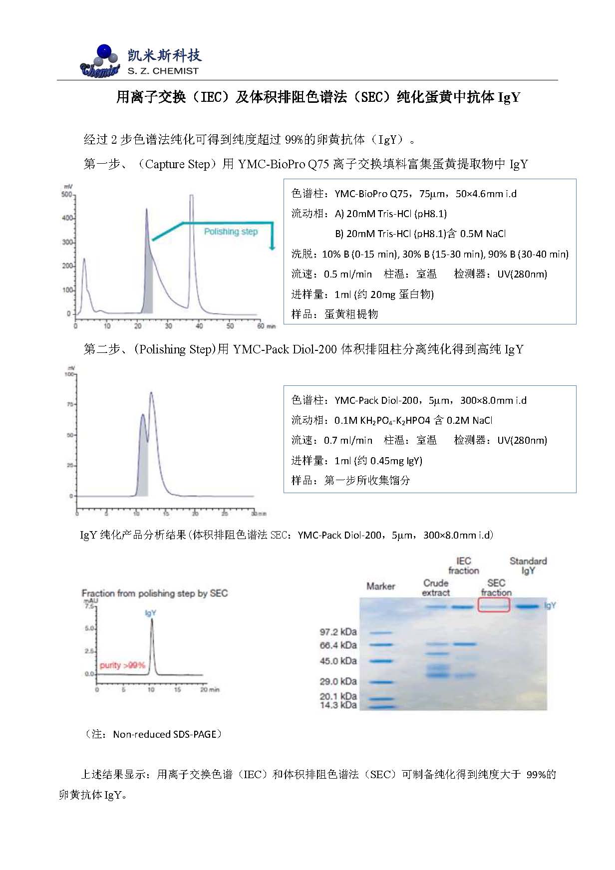 用YMC BioPro離子交換填料和Diol體積排阻色譜柱從蛋黃提取物中分離純化卵黃抗體IgY,純度超過99%。